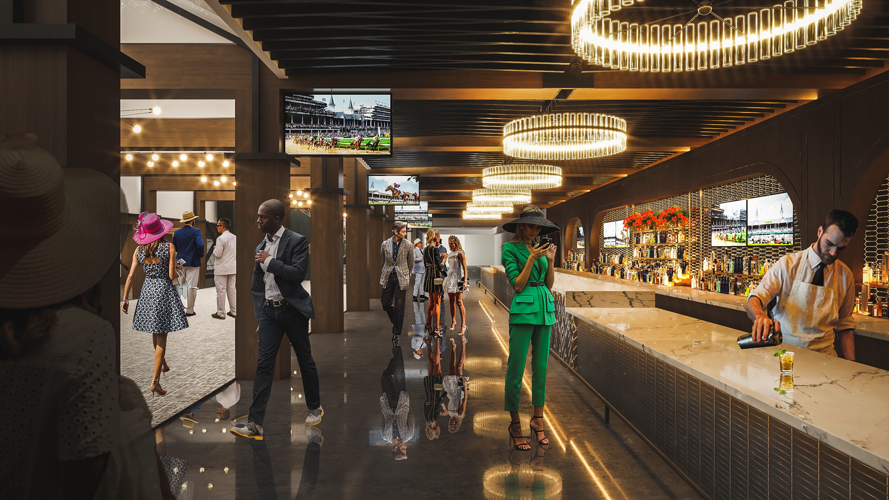 The Homestretch Club will renovate and update the grandstand area adjacent to the Twin Spires along the famed track’s homestretch. The project will convert what is currently outdoor bleacher seating next to the Winner’s Circle Suites and below the Jockey Club Suites into three unique seating options with all-inclusive amenities. This location offers an ideal view of the starting gate, a superior vantage of the track’s Big Board and a bird’s eye view of the homestretch as the horses thunder to the finish line. Ticketed guests in the Homestretch Club will have access to 18,600 sq. ft. of new interior premium hospitality space in the first-floor concourse area that will be transformed into a newly reimagined, high-end air-conditioned club atmosphere to place a bet, enjoy the all-inclusive food and beverage offerings and other amenities. This premium hospitality space will be accented by a grand staircase and a 100 ft. feature bar making it an elegant and desirable option for special events at historic Churchill Downs.