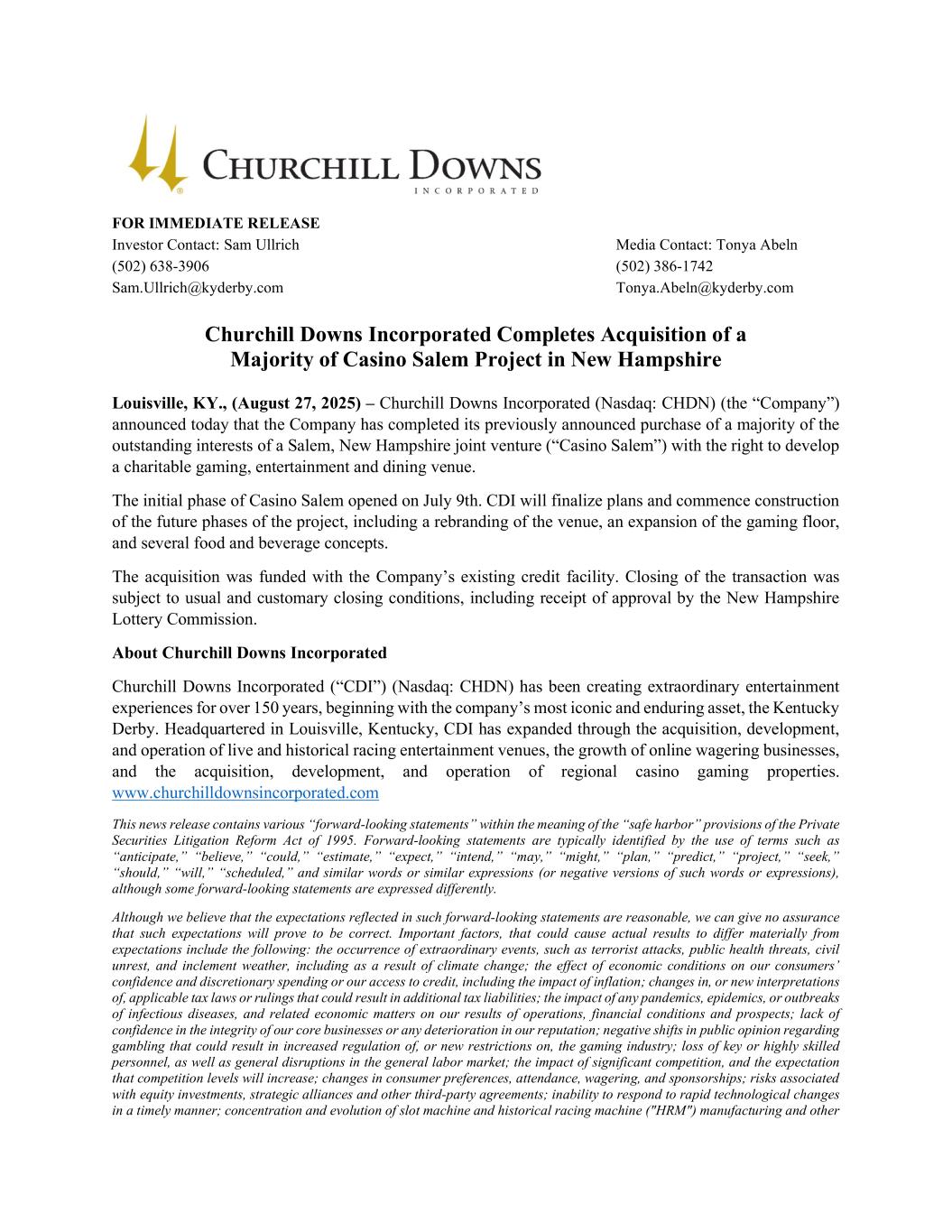 FOR IMMEDIATE RELEASE Investor Contact: Sam Ullrich Media Contact: Tonya Abeln (502) 638-3906 (502) 386-1742 Sam.Ullrich@kyderby.com Tonya.Abeln@kyderby.com Churchill Downs Incorporated Completes Acquisition of a Majority of Casino Salem Project in New Hampshire Louisville, KY., (August 27, 2025) – Churchill Downs Incorporated (Nasdaq: CHDN) (the “Company”) announced today that the Company has completed its previously announced purchase of a majority of the outstanding interests of a Salem, New Hampshire joint venture (“Casino Salem”) with the right to develop a charitable gaming, entertainment and dining venue. The initial phase of Casino Salem opened on July 9th. CDI will finalize plans and commence construction of the future phases of the project, including a rebranding of the venue, an expansion of the gaming floor, and several food and beverage concepts. The acquisition was funded with the Company’s existing credit facility. Closing of the transaction was subject to usual and customary closing conditions, including receipt of approval by the New Hampshire Lottery Commission. About Churchill Downs Incorporated Churchill Downs Incorporated (“CDI”) (Nasdaq: CHDN) has been creating extraordinary entertainment experiences for over 150 years, beginning with the company’s most iconic and enduring asset, the Kentucky Derby. Headquartered in Louisville, Kentucky, CDI has expanded through the acquisition, development, and operation of live and historical racing entertainment venues, the growth of online wagering businesses, and the acquisition, development, and operation of regional casino gaming properties. www.churchilldownsincorporated.com This news release contains various “forward-looking statements” within the meaning of the “safe harbor” provisions of the Private Securities Litigation Reform Act of 1995. Forward-looking statements are typically identified by the use of terms such as “anticipate,” “believe,” “could,” “estimate,” “expect,” “intend,” “may,” “might,” “plan,” “predict,” “project,” “seek,” “should,” “will,” “scheduled,” and similar words or similar expressions (or negative versions of such words or expressions), although some forward-looking statements are expressed differently. Although we believe that the expectations reflected in such forward-looking statements are reasonable, we can give no assurance that such expectations will prove to be correct. Important factors, that could cause actual results to differ materially from expectations include the following: the occurrence of extraordinary events, such as terrorist attacks, public health threats, civil unrest, and inclement weather, including as a result of climate change; the effect of economic conditions on our consumers’ confidence and discretionary spending or our access to credit, including the impact of inflation; changes in, or new interpretations of, applicable tax laws or rulings that could result in additional tax liabilities; the impact of any pandemics, epidemics, or outbreaks of infectious diseases, and related economic matters on our results of operations, financial conditions and prospects; lack of confidence in the integrity of our core businesses or any deterioration in our reputation; negative shifts in public opinion regarding gambling that could result in increased regulation of, or new restrictions on, the gaming industry; loss of key or highly skilled personnel, as well as general disruptions in the general labor market; the impact of significant competition, and the expectation that competition levels will increase; changes in consumer preferences, attendance, wagering, and sponsorships; risks associated with equity investments, strategic alliances and other third-party agreements; inability to respond to rapid technological changes in a timely manner; concentration and evolution of slot machine and historical racing machine ("HRM") manufacturing and other