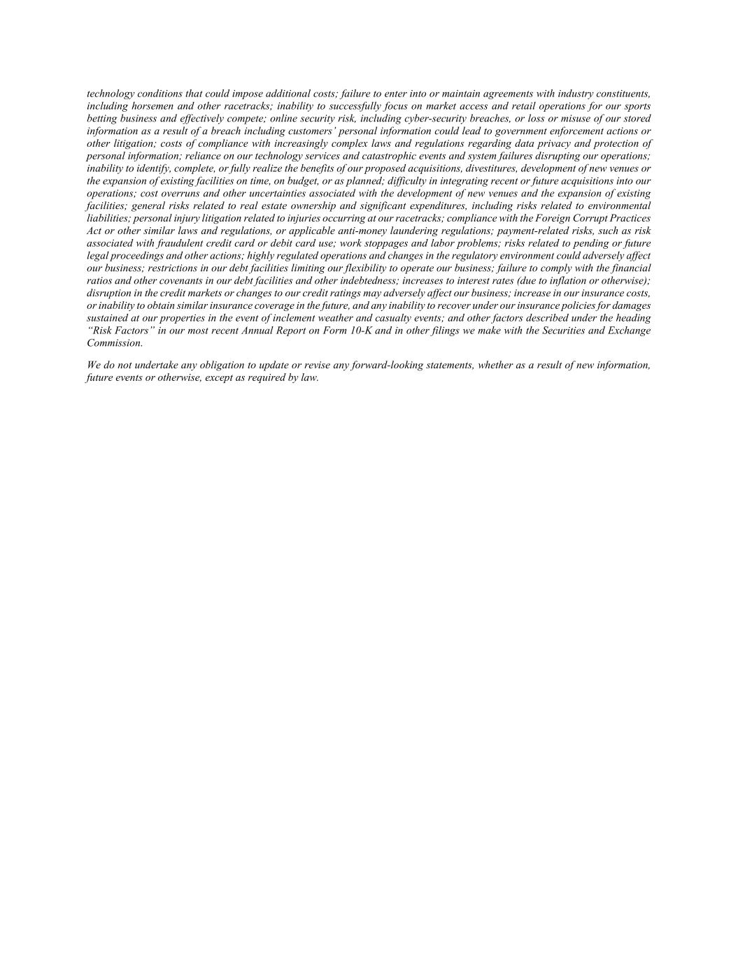 technology conditions that could impose additional costs; failure to enter into or maintain agreements with industry constituents, including horsemen and other racetracks; inability to successfully focus on market access and retail operations for our sports betting business and effectively compete; online security risk, including cyber-security breaches, or loss or misuse of our stored information as a result of a breach including customers’ personal information could lead to government enforcement actions or other litigation; costs of compliance with increasingly complex laws and regulations regarding data privacy and protection of personal information; reliance on our technology services and catastrophic events and system failures disrupting our operations; inability to identify, complete, or fully realize the benefits of our proposed acquisitions, divestitures, development of new venues or the expansion of existing facilities on time, on budget, or as planned; difficulty in integrating recent or future acquisitions into our operations; cost overruns and other uncertainties associated with the development of new venues and the expansion of existing facilities; general risks related to real estate ownership and significant expenditures, including risks related to environmental liabilities; personal injury litigation related to injuries occurring at our racetracks; compliance with the Foreign Corrupt Practices Act or other similar laws and regulations, or applicable anti-money laundering regulations; payment-related risks, such as risk associated with fraudulent credit card or debit card use; work stoppages and labor problems; risks related to pending or future legal proceedings and other actions; highly regulated operations and changes in the regulatory environment could adversely affect our business; restrictions in our debt facilities limiting our flexibility to operate our business; failure to comply with the financial ratios and other covenants in our debt facilities and other indebtedness; increases to interest rates (due to inflation or otherwise); disruption in the credit markets or changes to our credit ratings may adversely affect our business; increase in our insurance costs, or inability to obtain similar insurance coverage in the future, and any inability to recover under our insurance policies for damages sustained at our properties in the event of inclement weather and casualty events; and other factors described under the heading “Risk Factors” in our most recent Annual Report on Form 10-K and in other filings we make with the Securities and Exchange Commission. We do not undertake any obligation to update or revise any forward-looking statements, whether as a result of new information, future events or otherwise, except as required by law.